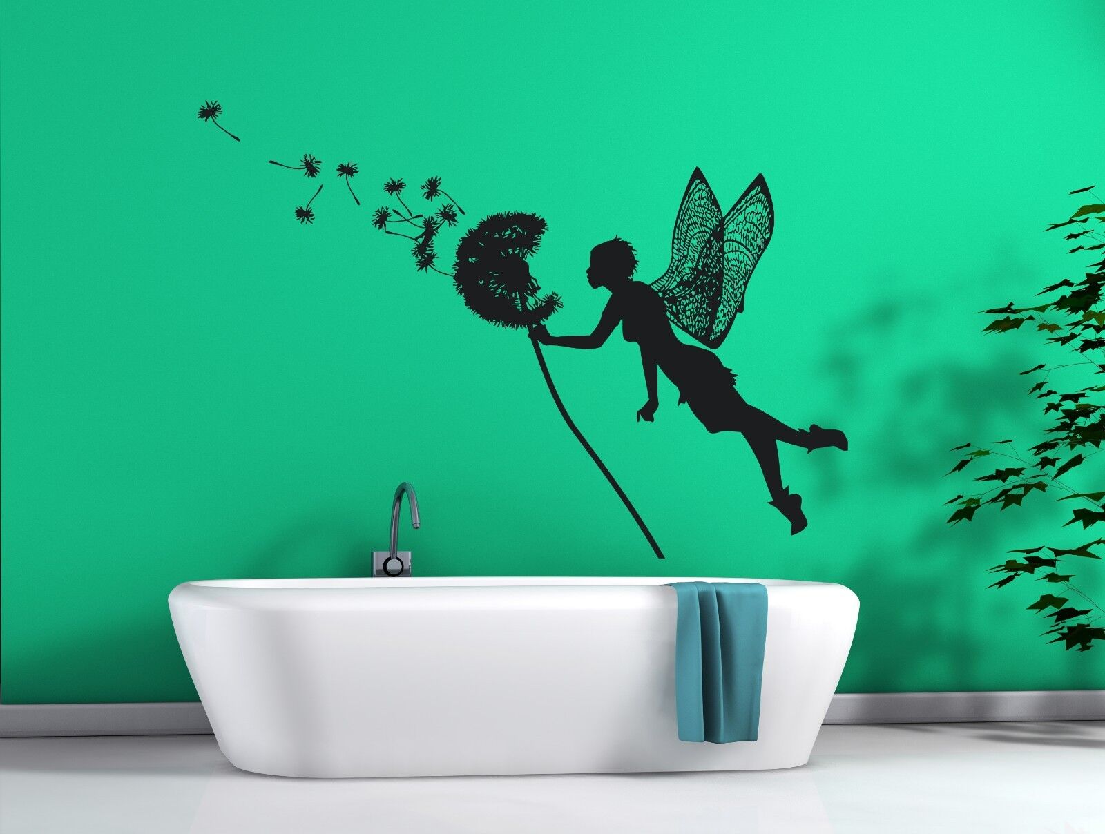 Wandaufkleber aus Vinyl, kleine Fee trägt Pusteblumensamen, die davonfliegen (n168)