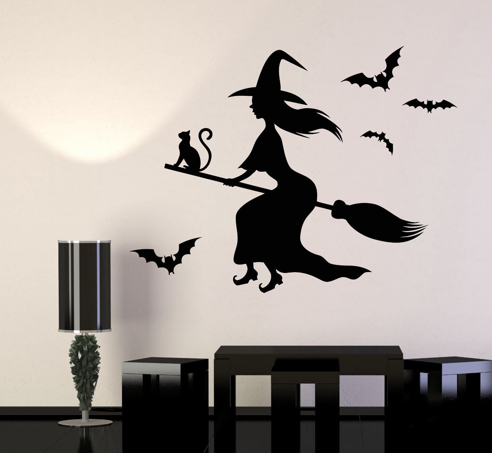 Autocollant mural en vinyle sorcière chat magique noir Besom Halloween autocollants (980ig)