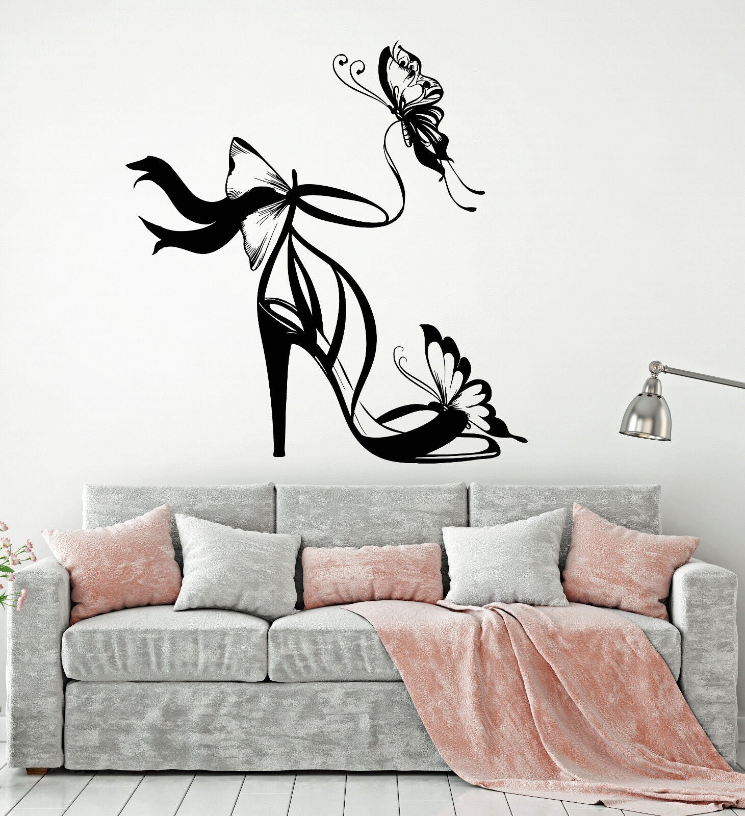 Autocollant mural en vinyle, chaussures pour femmes, papillon, mode fille, autocollants pour chambre (1329ig)