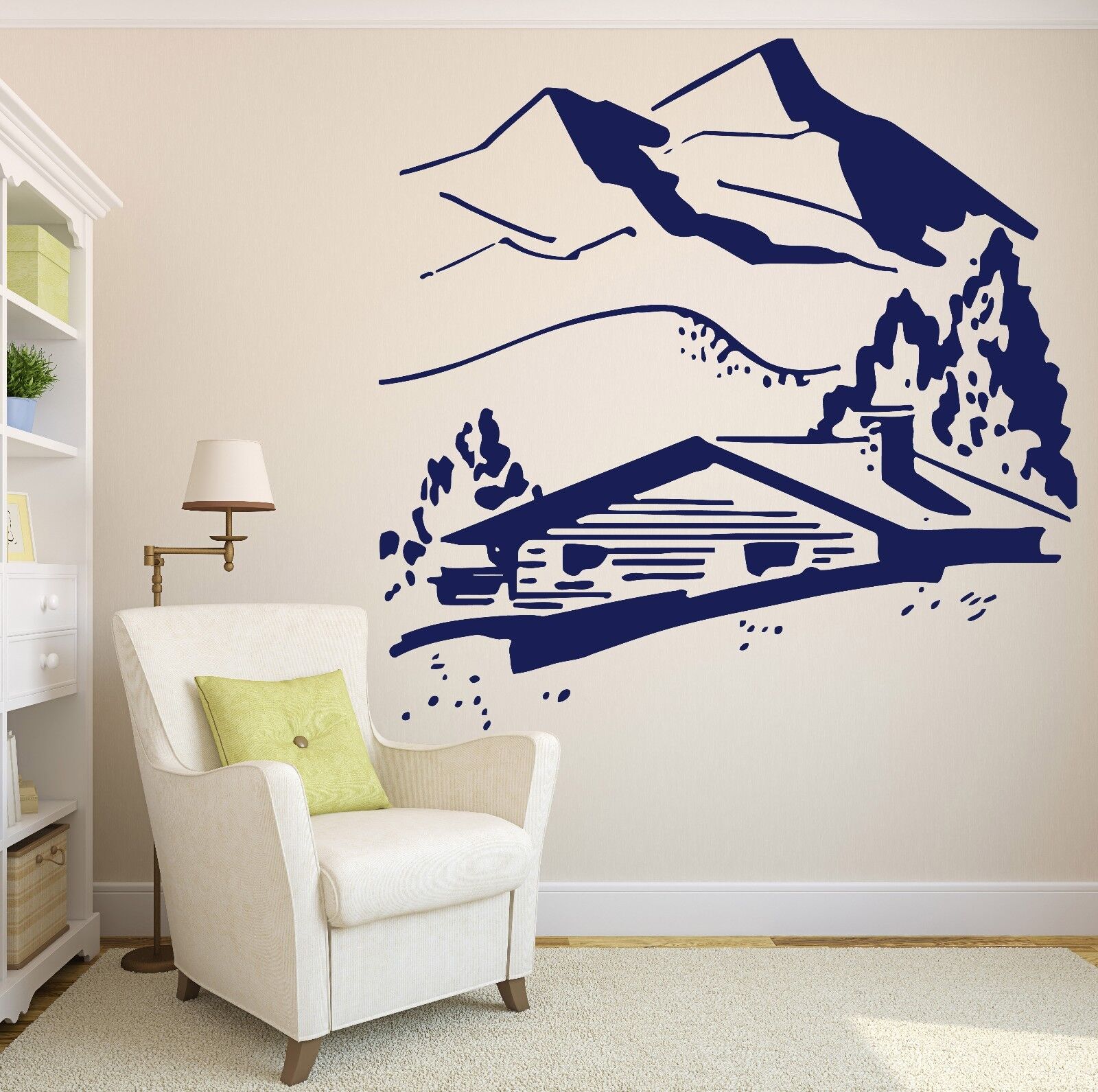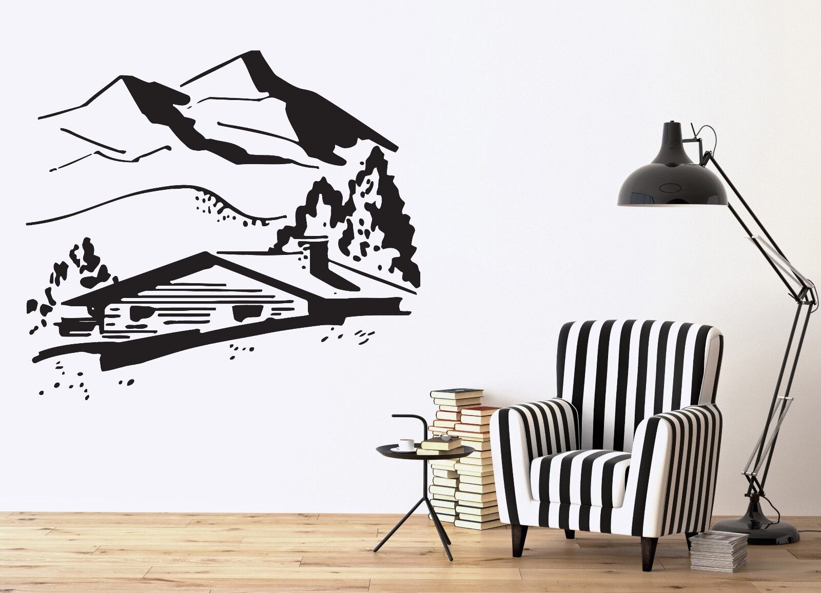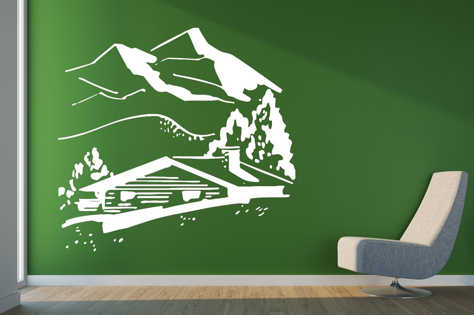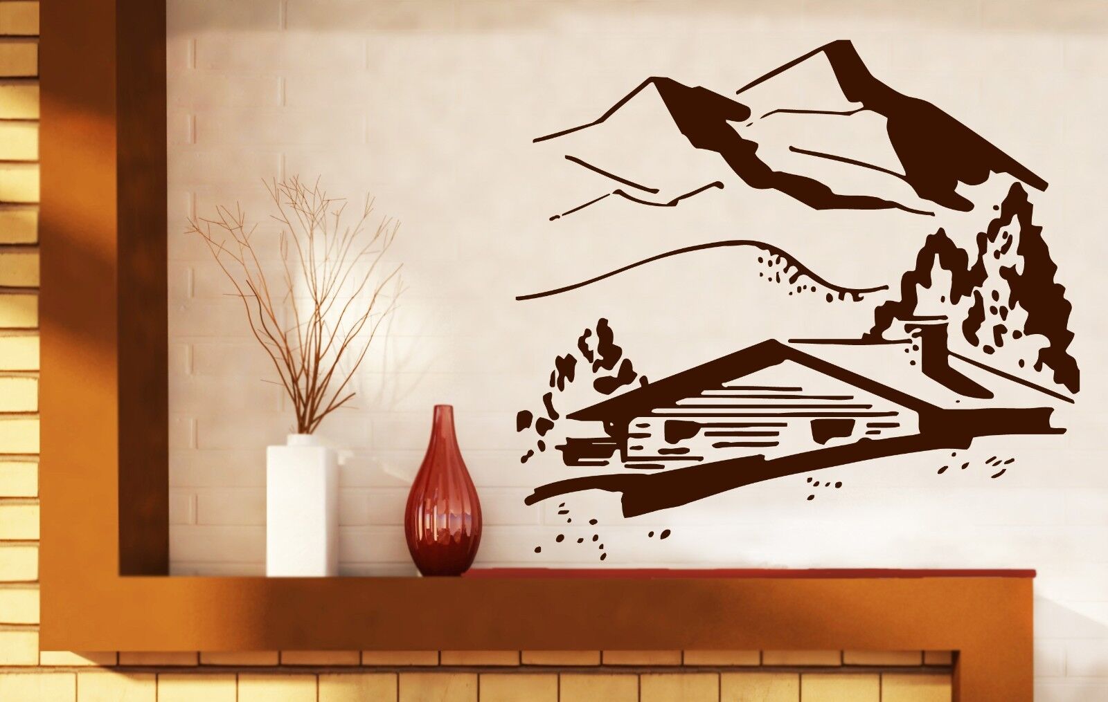 Autocollant mural en vinyle, chalet de montagne, pics enneigés, arbres (n253)